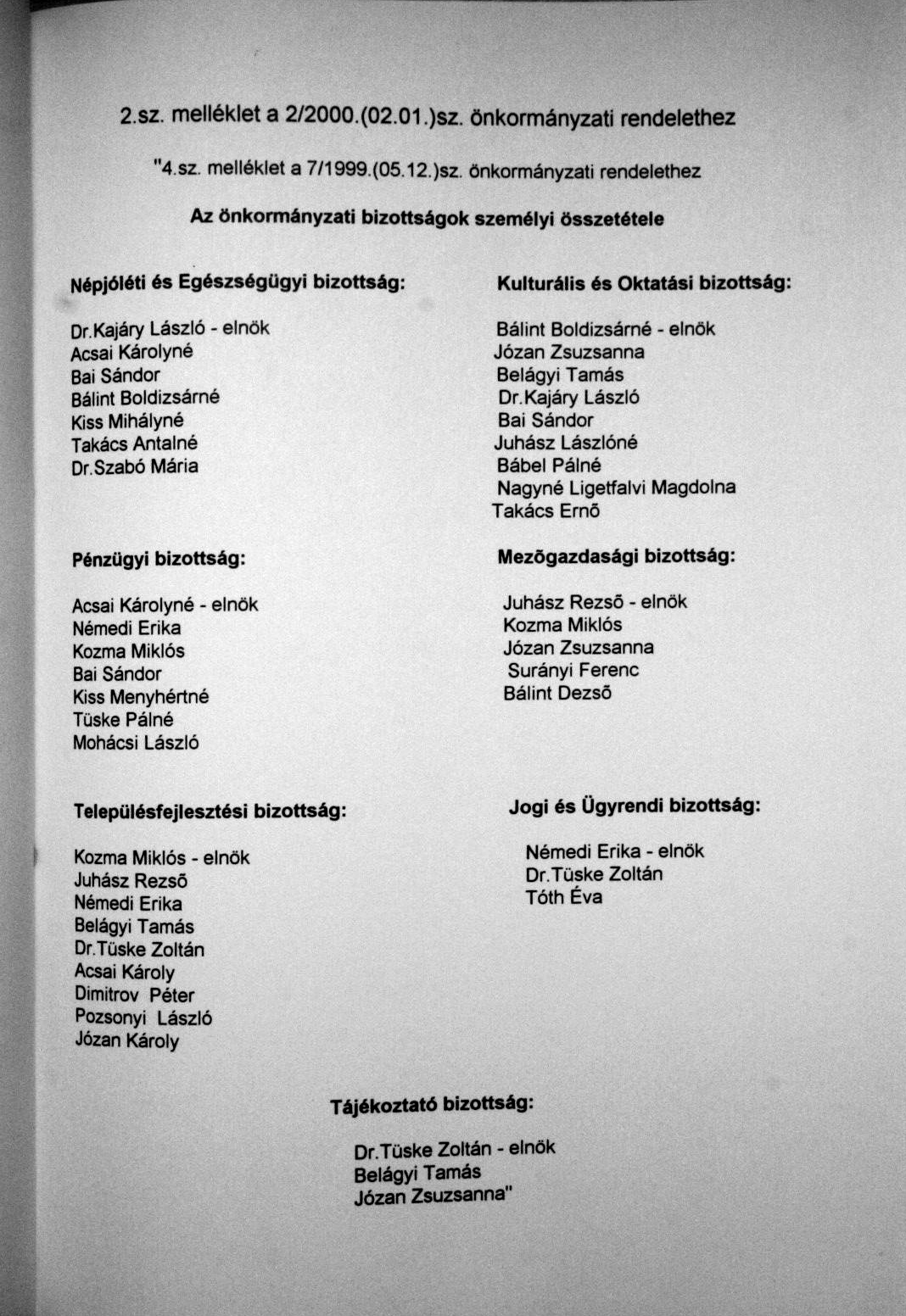Jogi, Ügyrendi, Pénzügyi, Mezőgazdasági, Népjóléti, Szociális, Egészségügyi, Kulturális, Oktatási, Településfejlési, Egyházügyi, Űrkutatási, Tájékoztató, Hatékonyság-elősegítő és Költségcsökkentést is Garantáló Bizottság