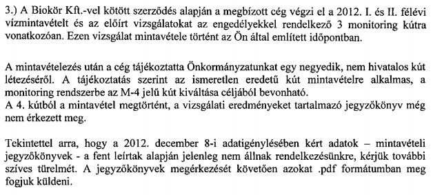 2012. december 8-án a Biokör Kft. az önkormányzat megbízásából mintát vett a sitt-lerakó déli oldalán lévő (nem hivatalos) monitoring kútból.
