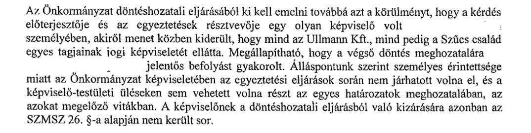 Ha ezt megspékeljük még azzal, hogy az aggályos jogi aktusban esetleg még pórul is járt az önkormányzat, akkor pedig különös értelmet kapnak a fenti gondolatok. A Budai és Kovács Ügyvédi Iroda által készített jogi szakvéleményben is említés esik az összeférhetetlenségről.