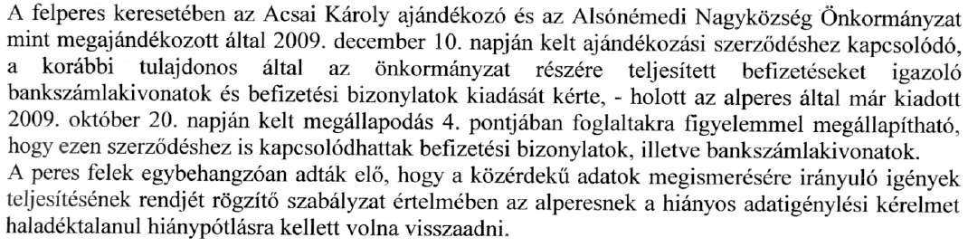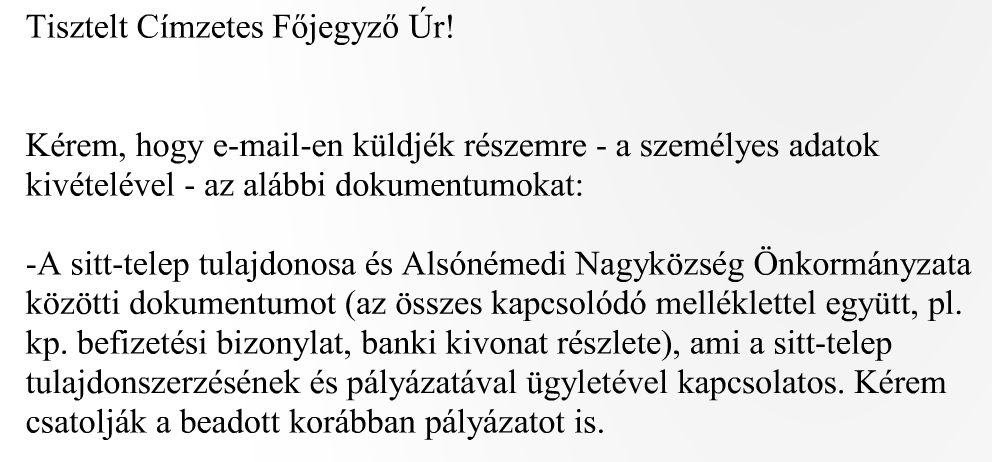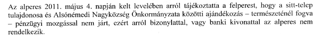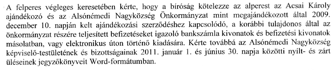 Azt viszont elmondtam, hogy egyetlenegy szemétbánya van Alsónémedin amit odaajándékoztak az alperesnek, egyetlenegy konkrét ajándékozási szerződéssel és egyetlenegy megállapodással és a kapcsolódó pénzforgalmi bizonylatokkal, ezért nem is lehet kérdés az adatigénylés egyértelműsége.