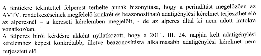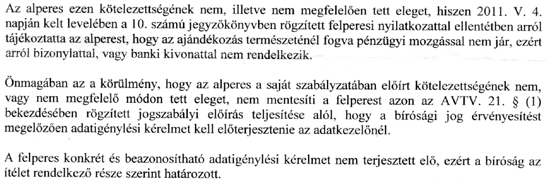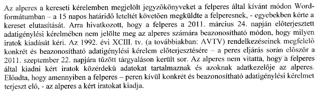 Az alperes nem járt el a saját szabályzata szerint, mert ha az igény nem lett volna pontos, azonnal értesítenie kellett volna az adatigénylőt. (Ezen egyáltalán nem csodálkozunk, de végre egy bíróság mondta ki.)