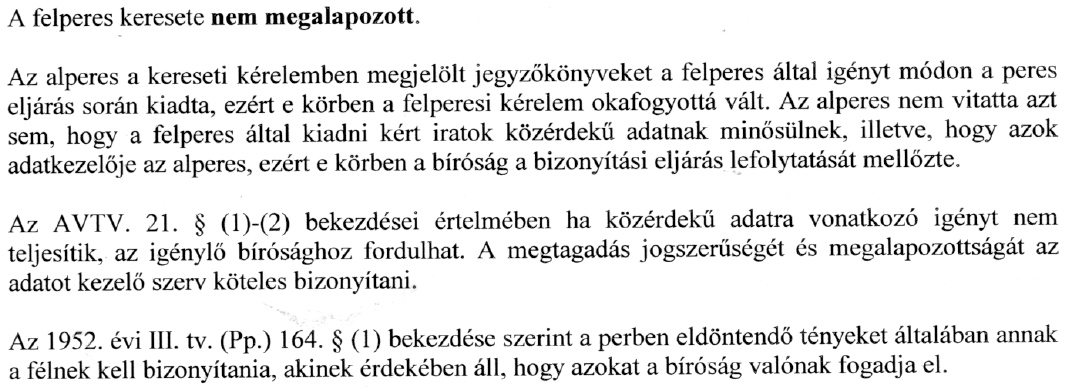 A legbizarrabb az volt, hogy az alperes azt is nyilatkozta, hogy mindvégig szándékában állt a közérdekű adatok kiadása. Ennek az általa becsatolt iratok is ellentmondtak.