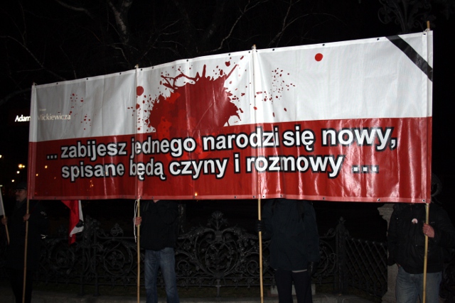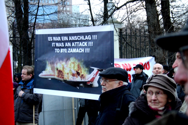 Azt sem lehet mondani, hogy félreérthetően fogalmaznak, az orosz követség előtt demonstrálók szerint a szmolenszki katasztrófa nem baleset volt. A demonstráció helyéből is egyértelműen kiderül, hogy kit is okolnak a tragédiáért.
