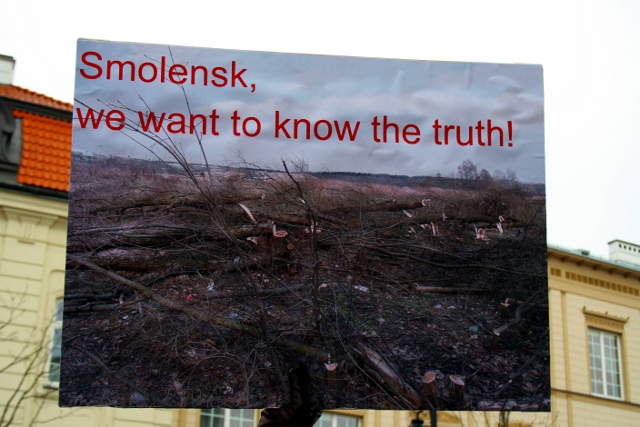 A lengyelek nem sokat akarnak, csak azt, ami egyébként mindenkinek járna: legalább tudni az igazságot. Sajnos ez még három év után sem adatott meg nekik. A varsói megemlékezés alatt órákon keresztül félkézzel feltartott táblán a katasztrófa másnapján kivágott fák láthatók, amik a katasztrófa idején takarták a tájékozódáshoz szükséges irányító fényeket és persze a felirat. Azt fontos megjegyezni, hogy a szmolenszki katasztrófa napja - április 10-e - még mindig munkanap a lengyelországban. Sok lengyelt megkérdeztünk erről, de érthető módon nyomdafestéket tűrően nem sok választ kaptunk.