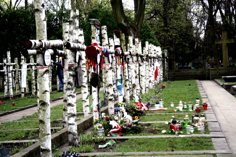 Idén tavasszal - a szmolenszki légikatasztrófa 4. évfordulóján - a varsói katonai temetőbe is ellátogattunk. A katonai temetőben - tisztelegve a harctéri temetések hagyománya előtt - nyírfakeresztek sorakoznak. Ezeket a kézzel feliratozott nyírfakereszteket és a sírokat hagyományokhoz foggal-körömmel valóban ragaszkodó lengyel cserkészek ápolják. A nyirfakereszteket meghatározott időközökkel felújítják vagy az általuk készítettekkel cserélik. Azt már nem is említve, hogy a nevezetesebb áldozatok hősi halálának évfordulóján a síroknál emlékeznek meg. Ottjártunkkor a varsói felkeléskor hősi halált halt két tizenéves (legjobb) barátra emlékeztek, a keresztekre sapkákat tettek, és kendőket kötöttek.