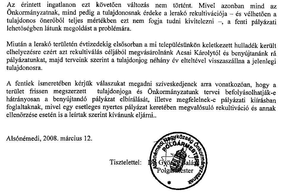 Alsónémedi Nagyközség Önkormányzat Képviselő-testülete egyetért azzal, hogy az Acsai Károly tulajdonában álló, valamikor kommunális hulladéklerakóként, majd sitt-lerakóként működtetett telep pályázati pénzek felhasználásával történő rekultivációja érdekében jelképes összegért önkormányzati tulajdonba vegye a területet, amennyiben a rekultivációhoz az Önkormányzatnak anyagilag nem kell hozzájárulnia és az feltétlenül szükséges a pályázat benyújtásához, egyben felhatalmazza a Polgármestert további tárgyalásokra a részletek tisztázása érdekében.