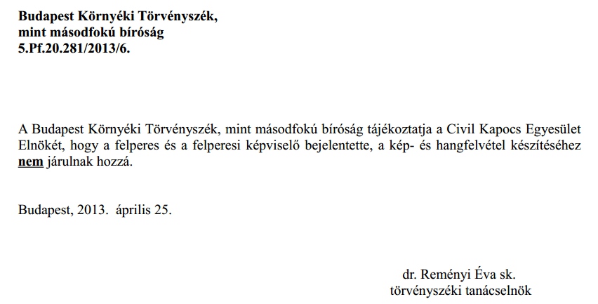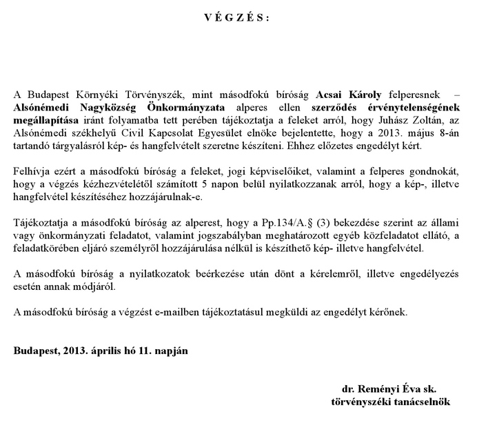 Később készült egy környezetvédelmi szakjogász által készített tanulmány is, amit persze az önkormányzat azóta is hét lakat alatt őriz. A szakvélemény legalább egy részének megismerése érdekében indított keresetünk most másodfokú szakaszban van. A lerakó korábbi tulajdonosa nem akaródzik visszavenni a rekultivációs kötelezettséggel terhelt lerakót, ebben az ügyben folyó bírósági eljárás szintén másodfokú szakaszban van. Erről a másodfokú eljárásról próbálunk első kézből tájékozódni: