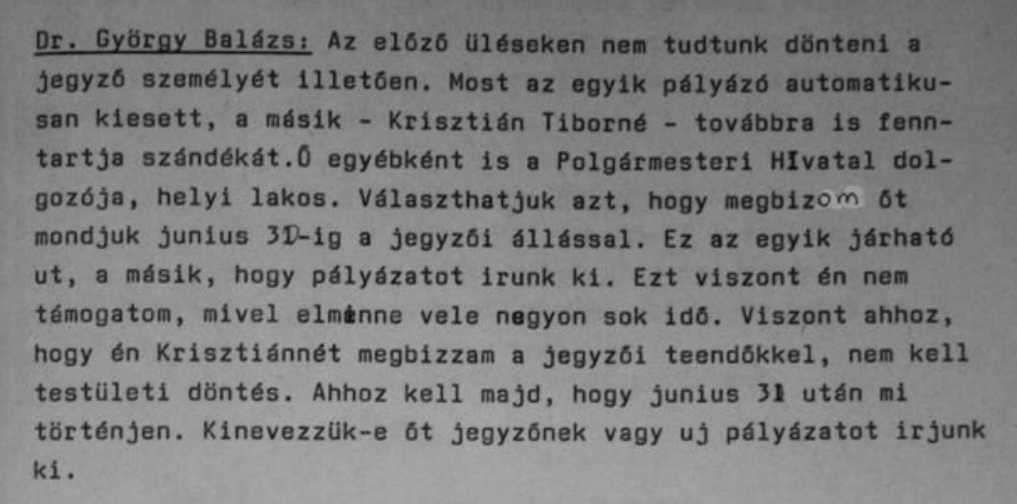 Enyhén szólva nem alakult ki konszenzus a leendő jegyző személyét illetően. A papírok szerint Győrfiné jobbnak látta Majosházán folytatni a pályafutását, de csak látszólagos lehetett ez a 'békés' távozás, mert a háttérben komoly ellentétek húzódhattak meg. Erre utal az is, hogy megboldogult dr. Kajáry képviselő úr szerint sem ártott volna egy kis nyugalmi időszak a képviselő-testületnek. Győrfiné ellen - nyomós indokként - kimondva-kimondatlanul az előző rendszerben betöltött korábbi szerepe szólhatott. A képviselő-testület Krisztián Tibornét (Némedi Erikát) bízta meg átmenetileg a jegyzői feladatok ellátásával. 1990. 01. 04. Astalavista Győrfiné >>>