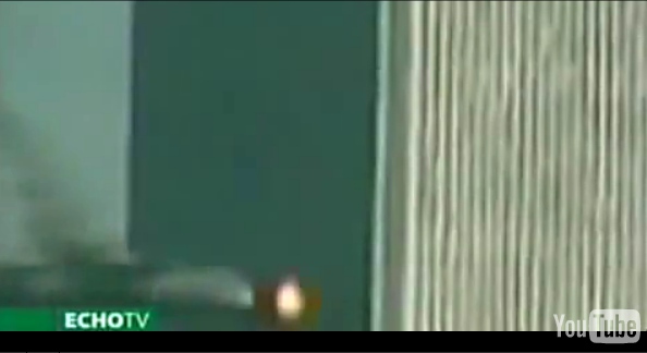 Ezen a videón is jól látszik a becsapódás előtt egy kis villanás a gép orránál a becsapódás előtti pillanatban...