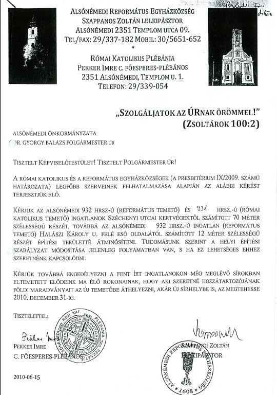 Pár hónappal később - 2010. júniusban - az egyházak közösen azzal keresték meg az önkormányzatot, hogy a helyi építési szabályzat módosításánál építési területté minősítsék a régi temetők mögötti 70 méteres és a Halászy Károly utca felé eső 12 méteres sávokat.