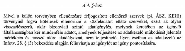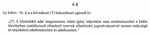 A parlament kivételes sürgős eljárásban fogadta el április 30-án azt a fideszes indítványt, amely alapján az Állami Számvevőszék és a Kormányzati Ellenőrzési Hivatal köteles ellenőrizni a közfeladatot ellátó szerveket, a közérdekű adat megismerésére irányuló igény pedig nem eredményezhet az ellenőrző szervek jogosítványaival azonos mélységű és terjedelmű adatbetekintést. Az indoklás ezt azzal egészíti ki, hogy azokat a "visszaélésszerű adatigényléseket", amelyek az adatkezelő működését jelentős mértékben és hosszú időre akadályoznák, nem kell teljesíteni...." MTI 2013. május 9., csütörtök 9:02